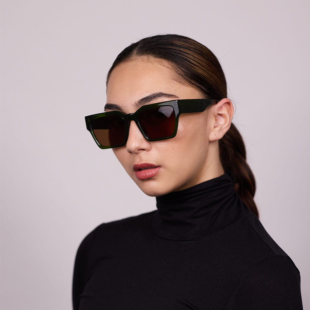 Our deep, muted black with a smooth, non-reflective finish, adds a modern, understated edge completed with either a Blue to Purple or green to brown lens.