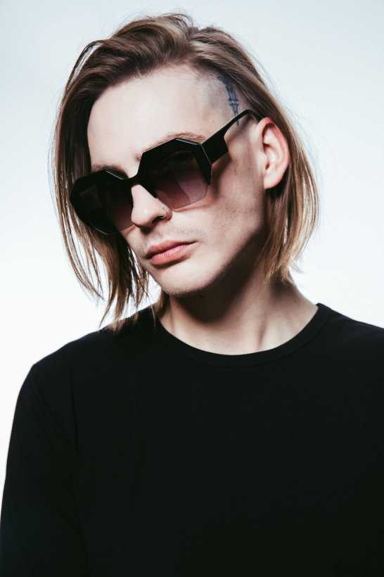 Designed for impact, featuring a bold acetate frame that cuts off at the lower edge to expose the lens.