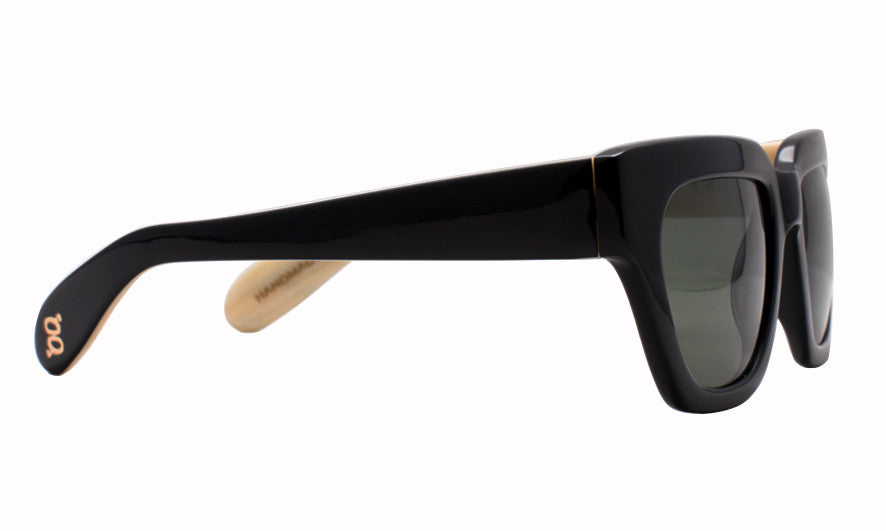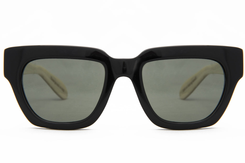 An Age Eyewear classic, the multi layered temple acetate in our signature Bone and Black stands out from the crowd with that extra attention to detail. Dark Green Lens.