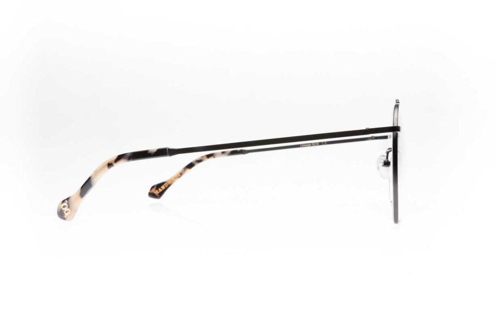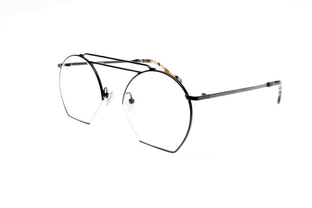 Bold and Black metal framing, paired with tonnes down, Matte Milky Torte Temples. Clear lens.